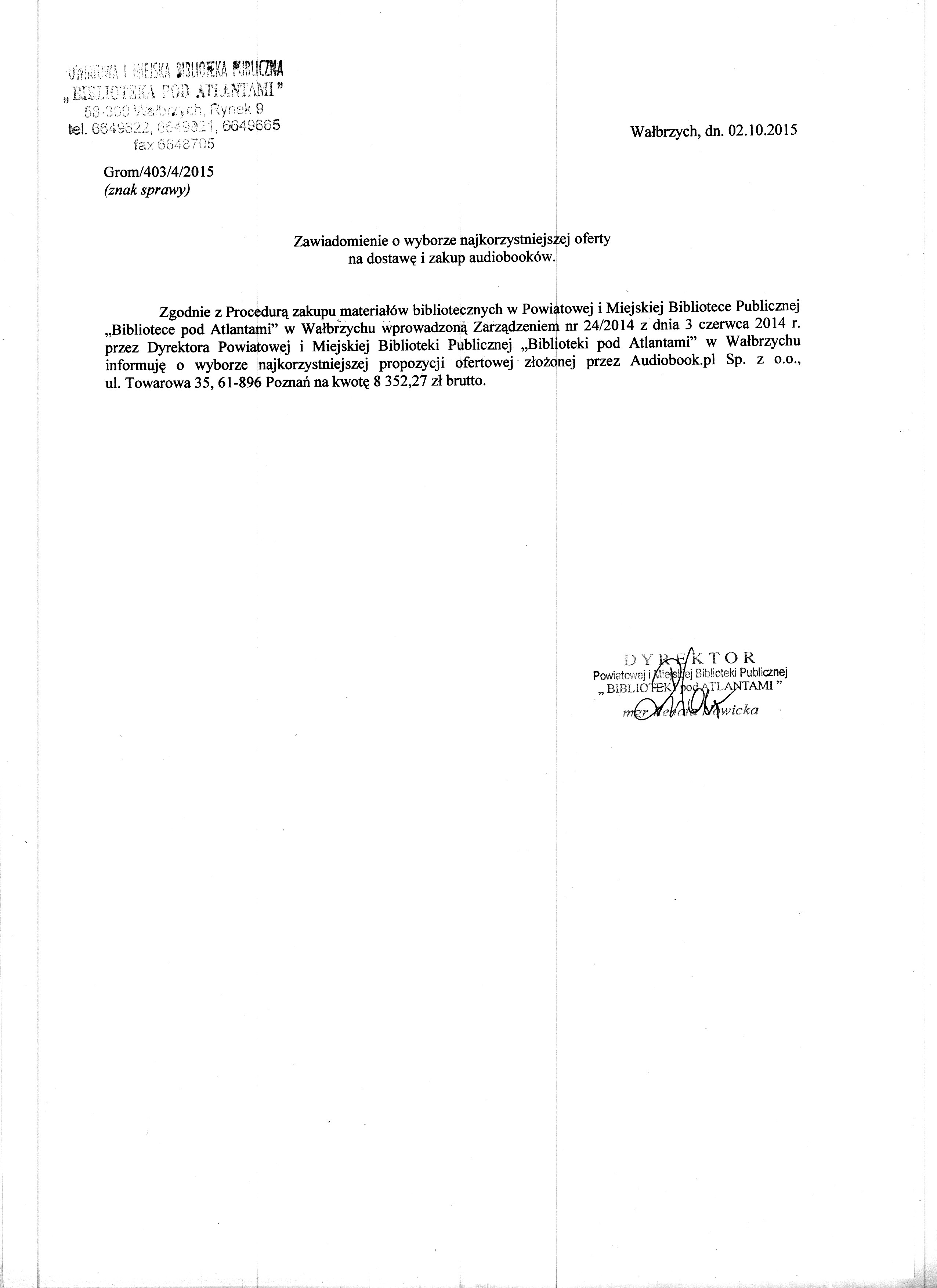 Zawiadomienie o wyborze najkorzystniejszej oferty na dostawe i zakup audiobooków (GROM/403/4/2015)